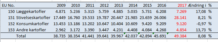 Vi har fået dugfriske tal fra Landbrug- og Fiskeristyrelsen (LFST), som har opgjort arealet med kartofler ud fra de netop indsendte EB-ansøgninger 2017. Som det ses, er der en stor stigning i læggekartoffelarealet, hvilket kan forklares ved den stigning, vi vil se i arealet med stivelseskartofler allerede nu, men også i de kommende år. Spisekartoffelarealet er nogenlunde status quo, mens gruppen ”Andre kartofler”, der dels dækker pulver- og chipskartofler men også kartofler til forarbejdning (Flensted), oplever en stigning. Så samlet en stigning i kartoffelarealet på ca. 8 %, hvilket man kun kan glæde sig over.