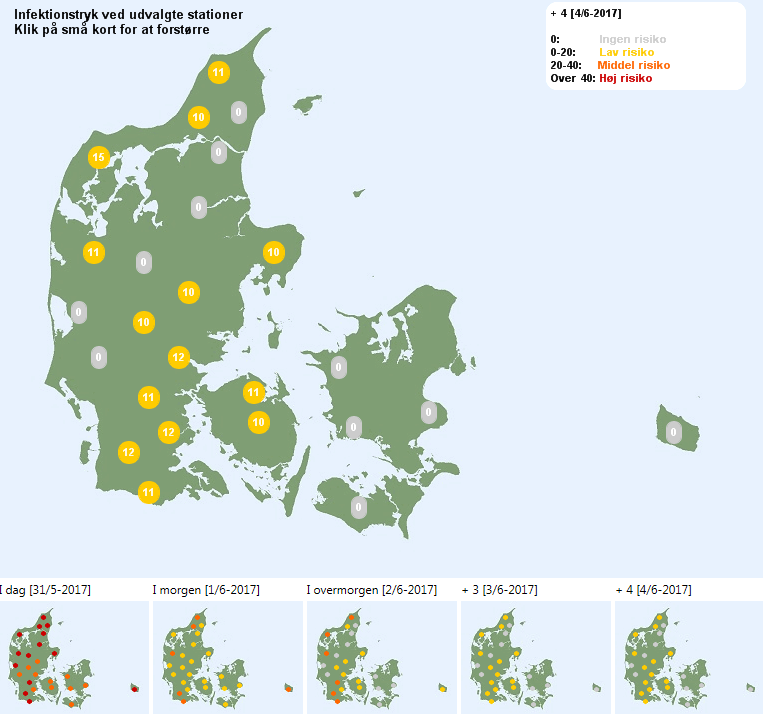 Infektionstrykket på udvalgte stationer vises for dags dato samt i fire dages prognose. På kortet kan man ofte se, at risikoværdierne er de samme i forskellige bælter hen over landet.