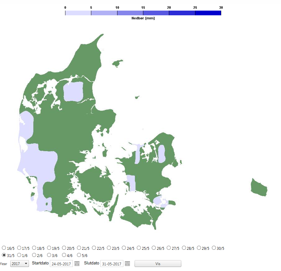 På nedbørskortet er det muligt at se nedbøren på én dag eller i en selvvalgt periode. Dette kan bruges dels til vanding men også i vurderingen i risikoen for angreb af jordbåren smitte (oospore) omkring fremspiring.