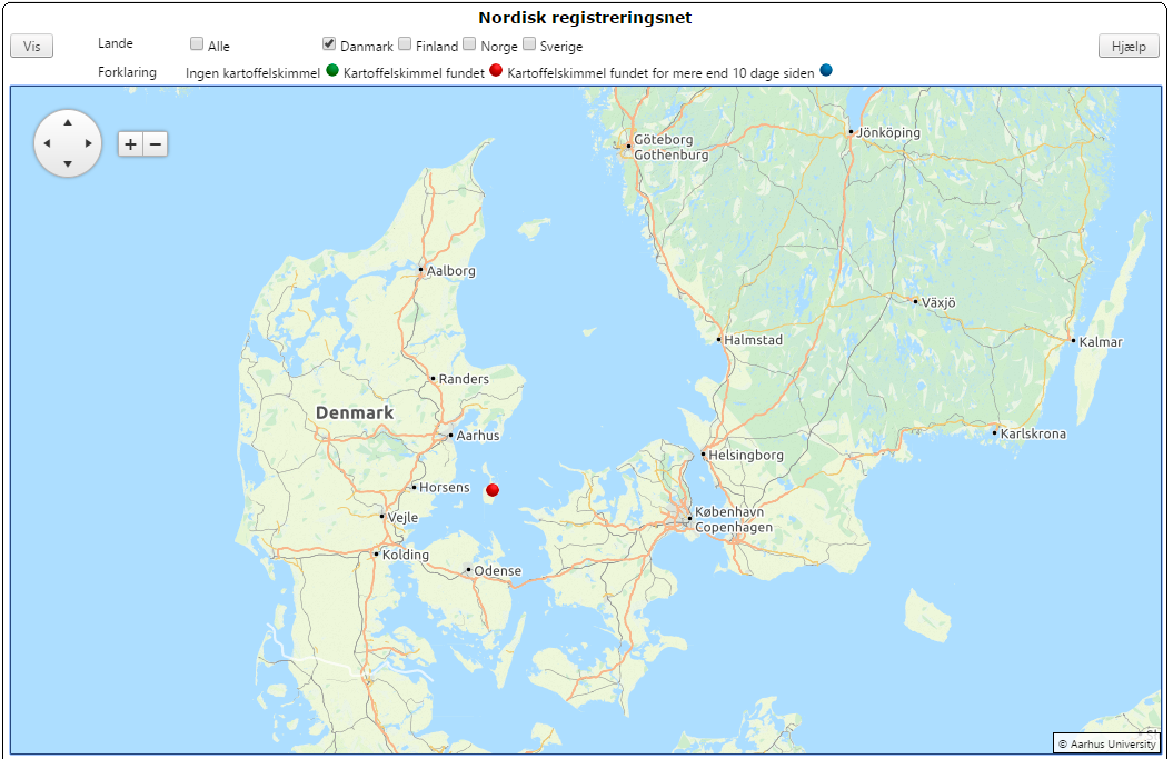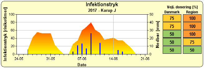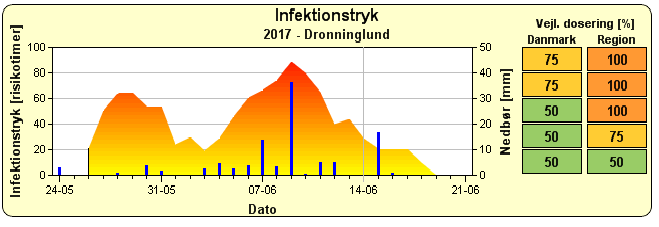 Indtil nu (14.06) er der kun registeret ét tilfælde af skimmel. Fundet er gjort i tidlige kartofler på Samsø. Da den danske sommer igen har vist sig fra sin mere velkendte og kølige side, byder den nærmeste periode derfor på lave infektionstryk. For de udvalgte lokaliteter se fig. 2