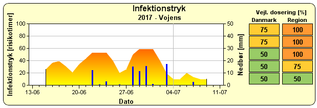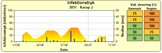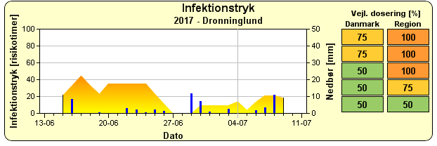 De steder, hvor der er fundet skimmel, vurderes det til at være godt under kontrol. På trods af, at det har været ”skimmelvejr”, har det alligevel været forholdsvist køligt og blæsende, hvilket har lagt en dæmper på udviklingen. Prognosen for infektionstrykket i den kommende periode viser, at det bliver ikke så skimmelfavorabelt vejr (Se nedenstående fig.). Anbefalingen mht. skimmelsprøjtningen for den kommende periode lyder derfor på 75 % dosis; dvs. 0,38 l/ha Ranman Top eller 0,45 l/ha Revus. Fuld dosering bør anvendes, hvor der har været skimmel i marken, som man har fået under kontrol med en Proxanil sprøjtning. Mange steder er man nu på 3. – 4. skimmelbehandling, og hvis der udelukkende er brugt Ranman Top, skal der skiftes middelvalg, jf. nedenstående om antal behandlinger.