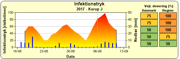 Efter par kolde nætter er der igen et ekstremt højt skimmeltryk over hele Jylland, og det ser ikke mere lovende ud den kommende uge. Vi er dog ved at være så langt henne i vækstsæsonen nu, at formålet med at behandle markerne med melkartofler, ikke længere er at bekæmpe skimmel, men at begrænse yderligere smitte og knoldskimmel. Behandling med Proxanil er derfor ikke længere relevant.