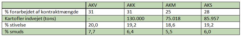 På pulverfabrikken er lagrene lidt over halvfyldte. Status er pæne kartofler med færre vandsure eller knoldskimmel end forventet i forhold til vejrforholdene.