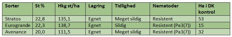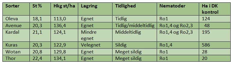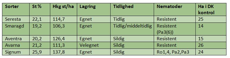 Nedenstående tabeller giver en oversigt over de sorter, der er en vis mængde af til rådighed af dansk oprindelse. Udbytterne er fra KMC´s sortsforsøg, hvor en sort afprøves i 3 år. Det er ikke nødvendigvis de samme 3 år, der er refereret til og man skal derfor være forsigtig med at sammenligne tallene direkte.