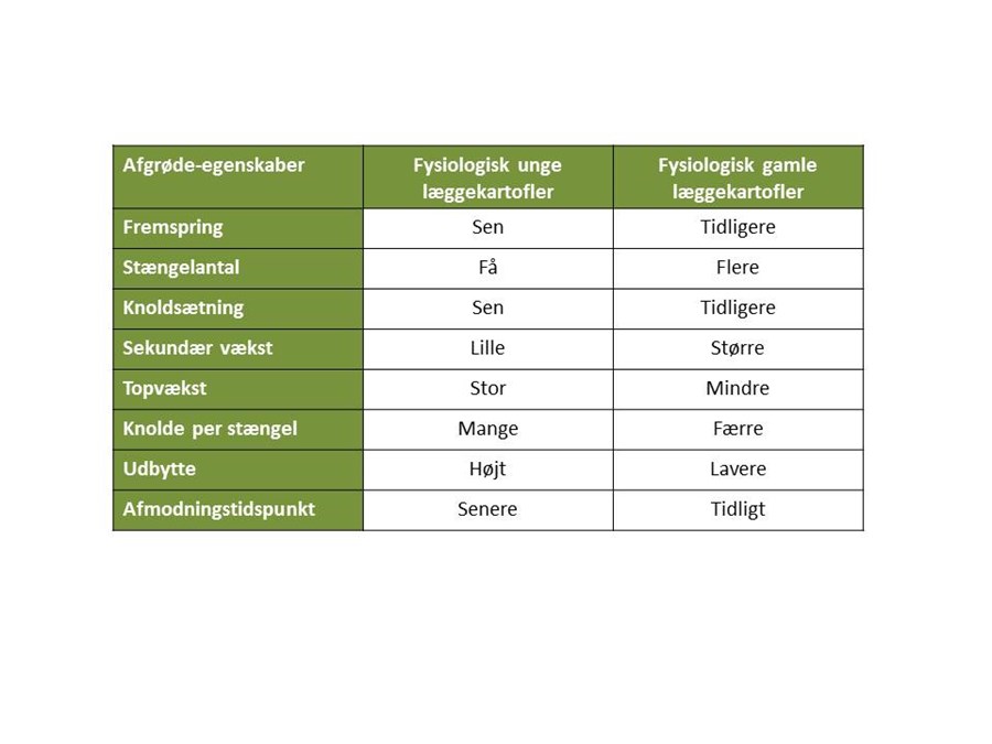 Den optimale fysiologiske alder af læggekartofler er forskellig alt efter, hvilken produktionsgren læggekartoflerne skal anvendes til. Ved dyrkning af tidlige spisekartofler skal der tilstræbes læggekartofler med relativ høj fysiologisk alder, hvilket generelt giver tidligere fremspring. Ved dyrkning af fabrikskartofler ønskes læggekartofler med ung fysiologisk alder, hvilket generelt giver lidt senere fremspiring, men også flere knolde pr. stængel end ved brug af fysiologisk ældre læggekartofler. Herunder ses oversigt over de største forskelle mellem fysiologisk gamle og fysiologiske unge kartofler.