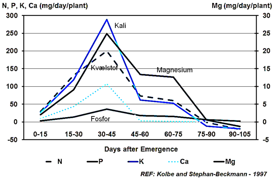 Figur 1. Daglig optagelse af N,P,K,Ca og Mg i forhold til dage efter kartoflernes fremspiring.
