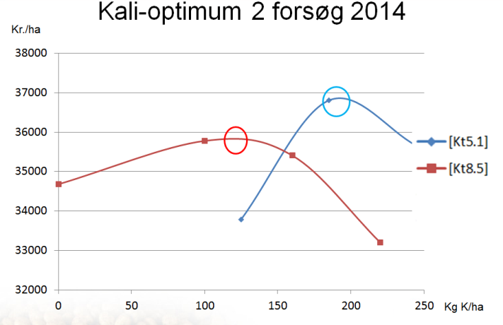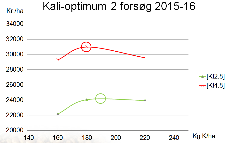 I 2015 og 2016 er der udført tilsvarende forsøg på JB1 med kalital på 4,8 og 2,8 (se figur 2). Her var optimum i intervallet 180-220 kg K/ha. Når magnesium tildeles i forholdet 1:4 (f.eks. 40 Mg:160K), som det vil være tilfældet i patentkali, hæmmes udbyttet i forhold til hvis magnesium tildeles i forholdet 1:8 (f.eks. 20 Mg:160K), som det er tilfældet i protamylasse/K2 (se tabel 1).