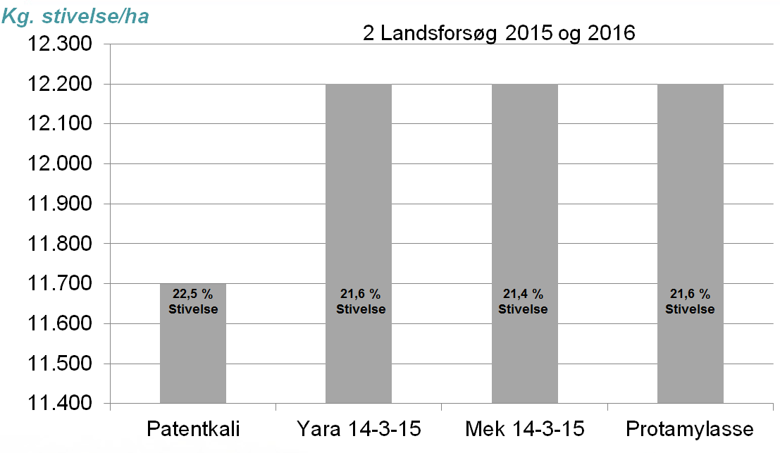 Effekten af protamylasse/K2 er i 2015 og 2016 sammenlignet med patentkali, mekanisk blandet 14-3-15 og samgranuleret 14-3-15. Som gennemsnit af de to forsøgsår var der kun små og ikke signifikante forskelle mellem forsøgsbehandlingerne (se figur 3). Protamylasse klarede sig således på linje med handelsgødning og det giver derfor god mening, at man som stivelsesavler anvender protamylasse, hvor det er praktisk muligt.