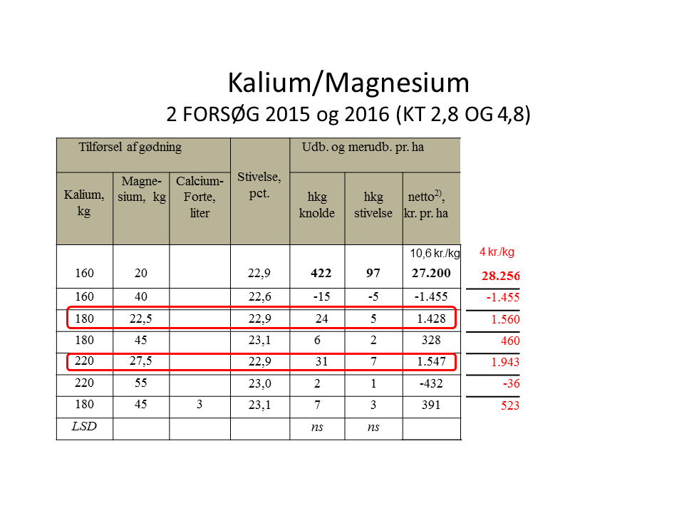 Tabel 1. Kalium og magnesium til stivelseskartofler – 2 landsforsøg 2015-16. Nettomerudbytte ved kalipris på 10,60 kr. og 4 kr./kg.