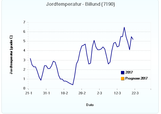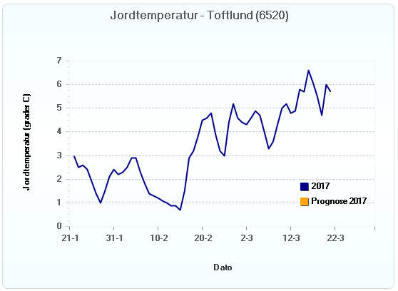 Som det ses af graferne fra 3 forskellige lokaliteter, så begynder jordtemperaturen at kravle opad trods de seneste dages kulde og regn. Jordtemperaturen er forbavsende ens, uanset hvilken lokalitet den måles på, og variationen mellem forskellige lokaliteter er højest 1°C. Lige så snart temperaturen nærmer sig de 8°C, bør man overveje at påbegynde kartoffellægningen. Men det er vel at mærke, hvis jorden er tjenlig og farbar samt at kartoflerne er klar til lægning.