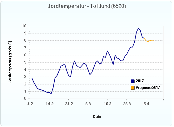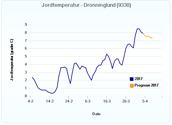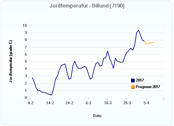 Som det ses af graferne fra 3 forskellige lokaliteter, svinger jordtemperaturen lige omkring de 9° C, dog med et lille dyk de sidste par dage som følge af nogle kolde nætter. Men jorden er nu ved at være så varm, at kartoffellægningen for alvor kan startes op. Med udsigten til stabilt tørvejr de næste 10 dage, er det således vigtigt at prioritere kartoffellægning fremfor såning af korn. Kartoflerne kvitterer for at have en lang vækstsæson med stor solindstråling. ALTSÅ tidlig lægning i bekvem jord = maksimal solindstråling og dermed maksimal vækstpotentiale.