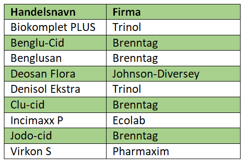Tabel 2 Liste med midler, der er godkendt til desinfektion af huse, kasser og maskiner.