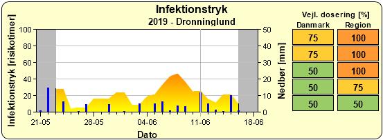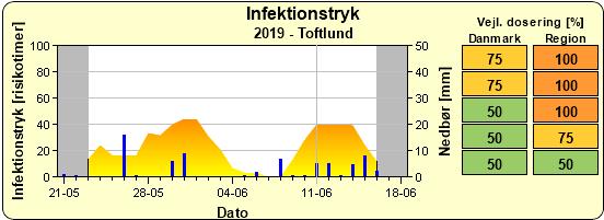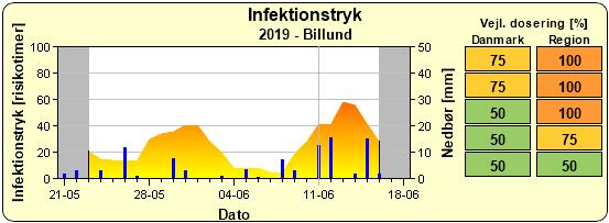 Der er risiko for kartoffelskimmel med seneste nedbørsforhold, fugtighed og temperaturforhold. I nedenstående oversigt af skimmelstyrings infektionstryk ses, at der i Billund forventes en højere risiko. Anbefalingen er denne uge, at forebygge skimlen med 0,3-0,4 l Revus pr. ha i kartoffelmarker, der har lukket rækkerne eller hvor toppen som minimum dækker kammen.
