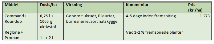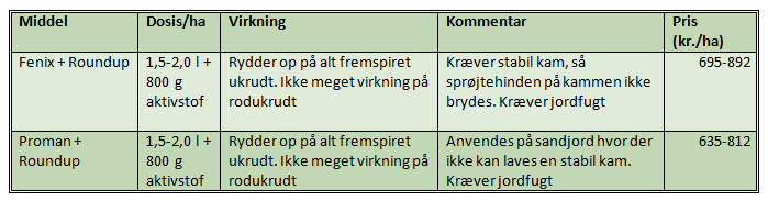 I blandingerne er der taget højde for, at vi sandsynligvis ikke får Titus til rådighed i år, og at vi så skal klare os igennem sæsonen, primært med sprøjtninger inden fremspiring af ukrudtet. Bruger man jordmidler som Fenix, Novitron og Proman skal man ikke satse på en mekanisk opfølgning men i stedet lade jordvirkningen om arbejdet. Få bestilt kemi hjem, hvis I allerede nu kan se, at strategien skal ændres.