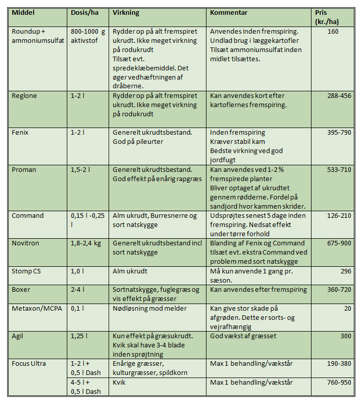 Mange vælger nok at lave en kombination af kemisk og mekanisk løsning i år. Det er vigtigt at alt ukrudtet svides af med den kemiske løsning. Brug her kun et afsvidningsmiddel som Roundup eller Reglone. Herefter skal ukrudtet bekæmpes på kimbladsstadiet. Hvis først ukrudtet er blevet for stort, kan man ikke længere rykke det op. Det er ofte et problem på toppen af kammen, hvor ukrudtet putter sig under kartoflerne.