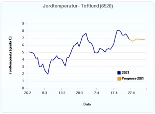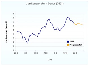 Jordtemperaturen har flere steder tidligere lige rundet de 8˚C men den mere kølige vejrtype, som ramte i sidste uge, har medvirket til at fald i jordtemperaturen.