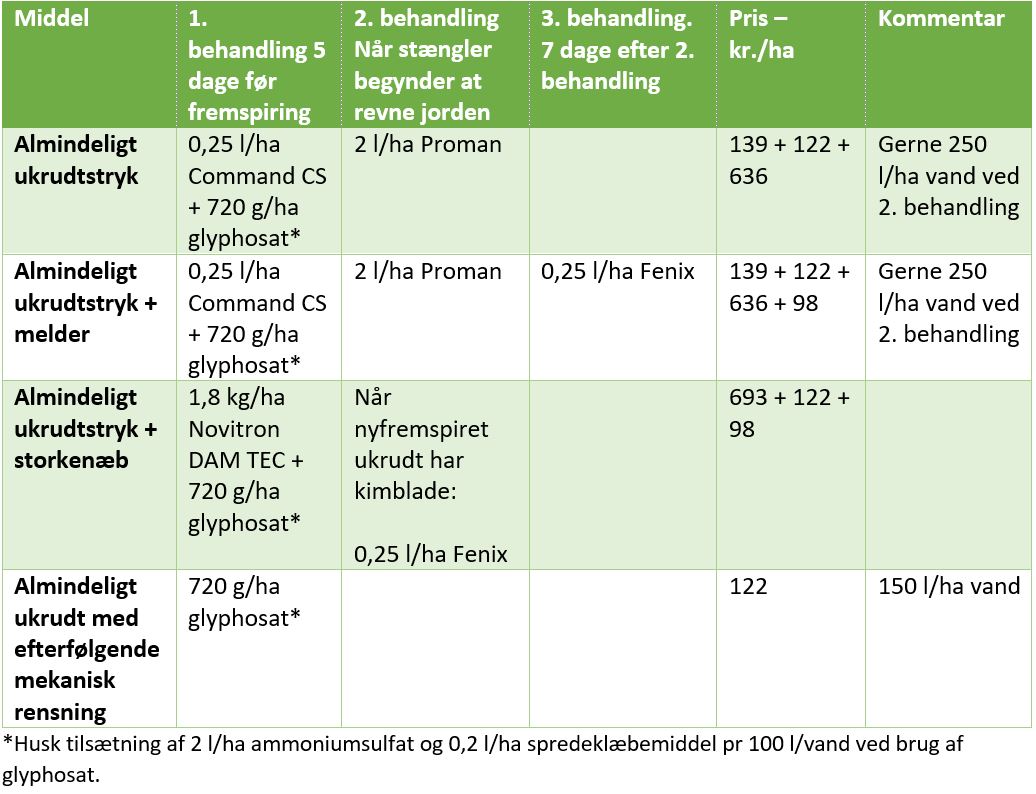 I andre typer kartofler end læggekartofler udgør glyphosat en vigtig brik i den kemiske ukrudtsbekæmpelse. I tabellen herunder fremgår en række strategier der dækker de mest gængse ukrudtsproblematikker. Vær opmærksom på at dosis af glyphosat er angivet som gram aktivstof/ha. Det anbefales altid at bruge 2 l/ha ammoniumsulfat og 0,2 l/ha spredeklæbemiddel sammen med de glyfosatholdige midler, da det erfaringsmæssigt giver en bedre effekt.