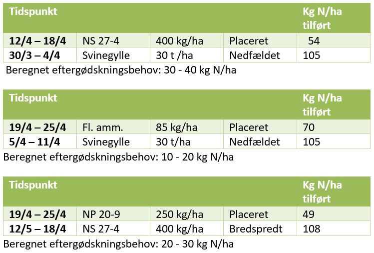 Nedenstående er eksempler på beregning af eftergødskningsbehov ved forskellige gødningsstrategier ved en nedbørsmængde på 160 mm i maj måned på en JB 1: