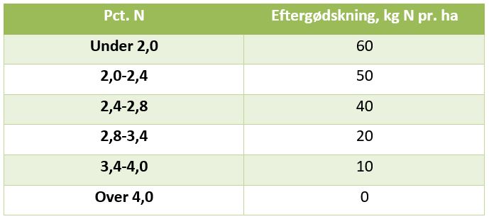 Er kvælstofindholdet lavere end ca. 4,0 pct., er der risiko for, at kvælstof er udbyttebegrænsende. Jo lavere kvælstofindholdet er, jo større er behovet for eftergødskning. I tabel 2 er givet forslag til graduering af eftergødskningen efter resultatet af planteanalysen.
