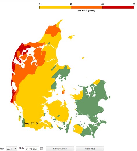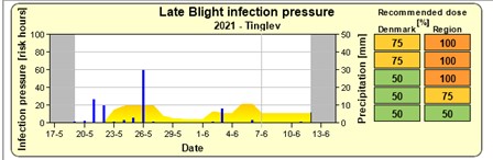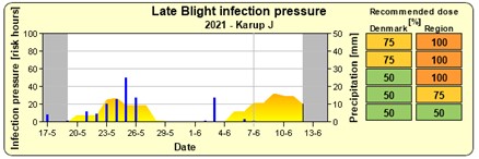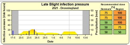 Den megen nedbør og forholdsvis høje temperaturer vi har haft, og igen ustadigt vejr i weekenden, har øget risikoen for primær angreb via oosporer fra jorden. Det skal tilføjes, at der endnu ikke er fundet angreb. Den kommende periode vi ser ind i viser, at det kan blive skimmelfavorabelt vejr i slutningen af ugen – se nedenstående figurer. Hovedparten af kartoflerne er fortsat meget små endnu; fra ingen er fremspiret til de står ca. 10 cm høje. Vi anbefaler derfor ikke generelt, at der skal behandles mod skimmel i denne uge. I tidlige spisekartofler bør der lægges en forebyggende skimmelbehandling ud nu i denne uge: f.eks. 0,3 l/ha Revus.