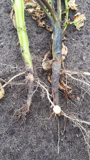 Billede Nye typer af sortben (P. parmentieri og P. brasiliense) kan vise andre symptomer end de velkendte klassiske symptomer. Til venstre angreb som kun ses på den underjordiske del af stænglen og ikke som den gamle velkendte til højre, hvor hele stænglen udvikler sort råd.