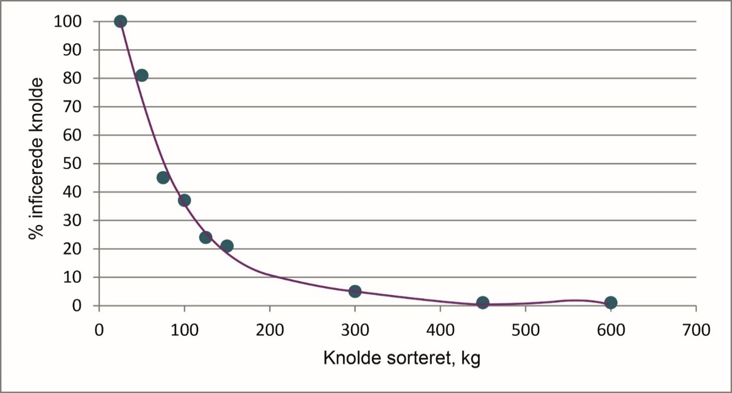 Spredning af sortben, hvis der findes bare én inficeret knold i de sorterede kartofler. Figuren viser, at er der én inficeret knold pr. 100 kg kartofler vil den potentielt kunne smitte 35-40% af de sorterede kartofler under sortering.