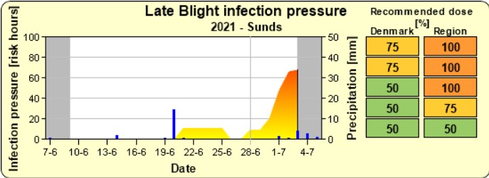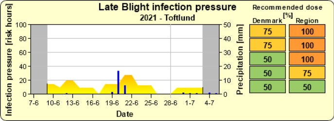 Vejrudsigten i dag for den kommende uge lover, at der kommer omslag i vejret, og det igen bliver mere fugtigt. Anbefalingen er, at der behandles med 0,3 l/ha Revus inden omslag i vejret.