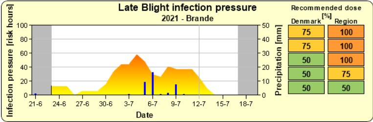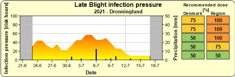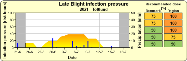 Det ustadige vejr har givet meget forskellige aftryk rundt om i landet, men det ser ud til at vejret bliver mere stabilt de kommende dage. Da skimmel er en infektion som vokser inde i blade til at starte med, og ikke nødvendigvis er synlig endnu, er anbefalingen at holde intervallet på 7 dage og køre med: