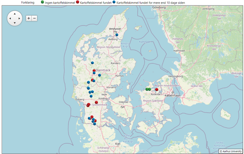 Der er daglige varslinger om skybrud og tordenvejr i øjeblikket, og de fleste har nu fået vand af forskellig mængde, de færreste steder dog nok til at vandingen kan holde en pause. Der er i løbet af sidste uge fundet skimmel, specielt i det Sønderjyske, dog enkeltplanter eller små pletter. Cikadenymferne findes nu i de tidligst fremspirede marker, og behandling er relevant, hvis der findes en stor stigning i antallet over få dage. Der findes også i Sønderjylland nogle coloradobiller.