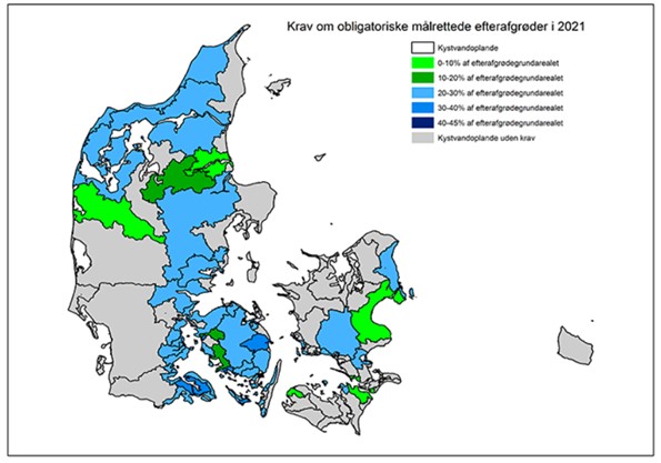 Landbrugsstyrelsen har netop sendt kortet med de obligatoriske målrettede efterafgrøder ud, og inden længe kan kravet ses i GKEA-skemaet i Tastselv-service. Kortet ses herunder – opfylder man ikke sit krav, sker der en automatisk reduktion af kvælstofkvoten på op til 150 kg/N pr hektar på det antal hektar, som mangler at blive opfyldt.