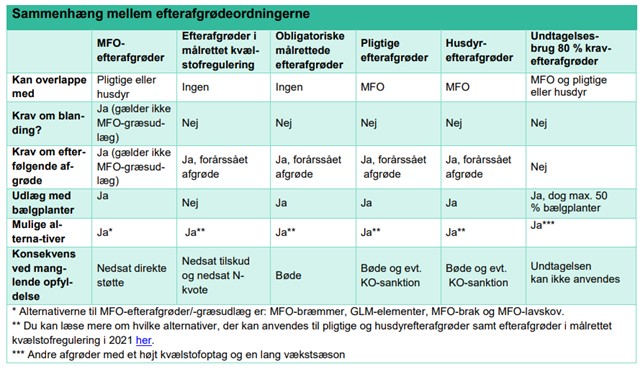 Tabel 1: Landbrugsstyrelsens tabel over kombinationsmuligheder og diverse krav til de forskellige typer af efterafgrøder.