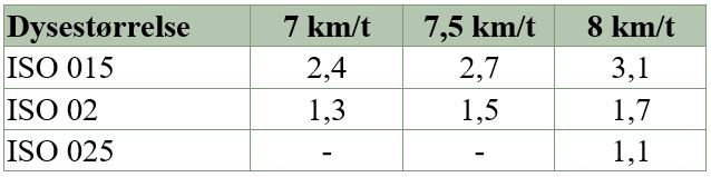 Tabellen viser hvilke hastigheder og tryk, der udbringer 90 liter pr. ha.
