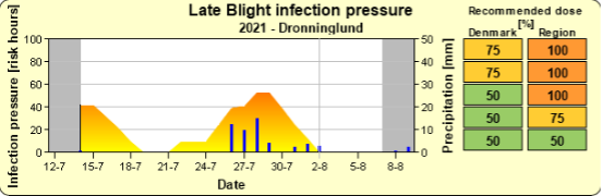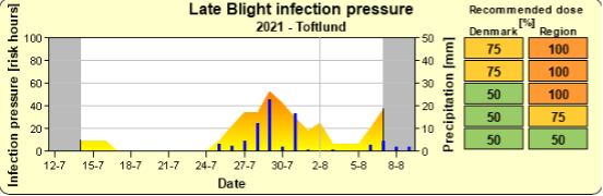 Vi har netop været inde i en højrisiko periode, hvor der er sket stor spredning af sporer, og der er en del angreb i mange marker, specielt i den centrale del af jylland. Få kartoflerne dækket ind så de ikke står ubeskyttet og hav især fokus på de sorter der bliver ved med at sætte nye blade (bl.a. Kuras)