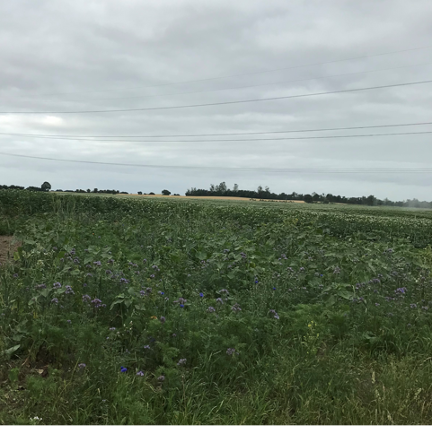 Sørg samtidigt for at hjørner, indkørsler og hul mellem foragre og mark holdes fri for ukrudt eller bliver sået til med andet for ikke at give de vanskelige ukrudtsarter frit spil. På billedet er der sået blomsterblanding i hjørnerne. Så sørger man for at der er modstand til ukrudtet, det ser lidt pænt ud og giver insekter og vildtet et sted at finde lidt føde.
