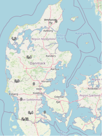 Lusetællingen for uge 30 kan ses op ovenstående kort. Der er også indsendt en prøve fra Rødby, men der har været sand i prøven så lusene kan ikke specifik bestemmes. Der har imidlertid været rigtig mange lus i prøven = stor risiko for smitte ca. 50-70 stk., hvor der i de andre prøver bliver fundet 0-5 bladlus.