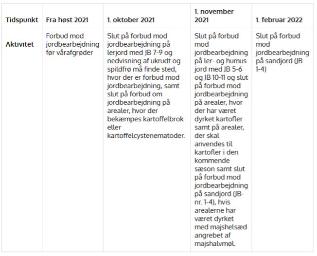 Det betyder at for langt hovedparten af brugsavlerne først må starte jordbearbejdning 1. november på arealer som har været dyrket med kartofler i 2021. For autoriserede læggekartoffelavlere samt spisekartoffelavlere må jordbearbejdning forud for kartofler i 2022 påbegyndes pr. 1 november.