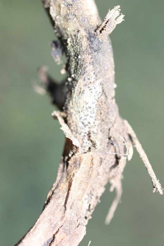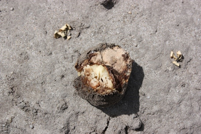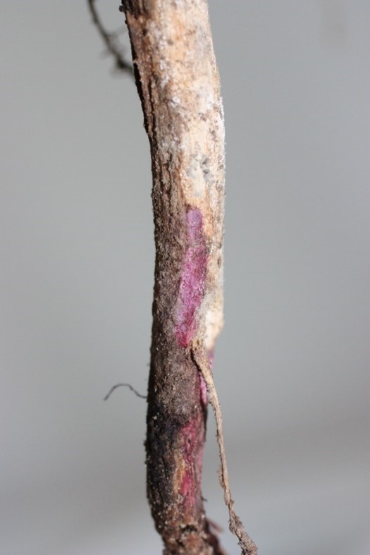 Figur 2. Black dot ses ved sorte prikker på rødder og stængler og lilla misfarvning af afmodnede stængler.