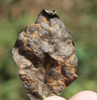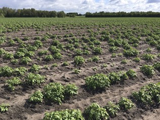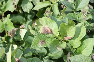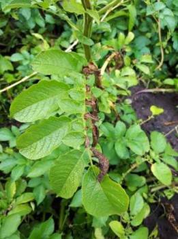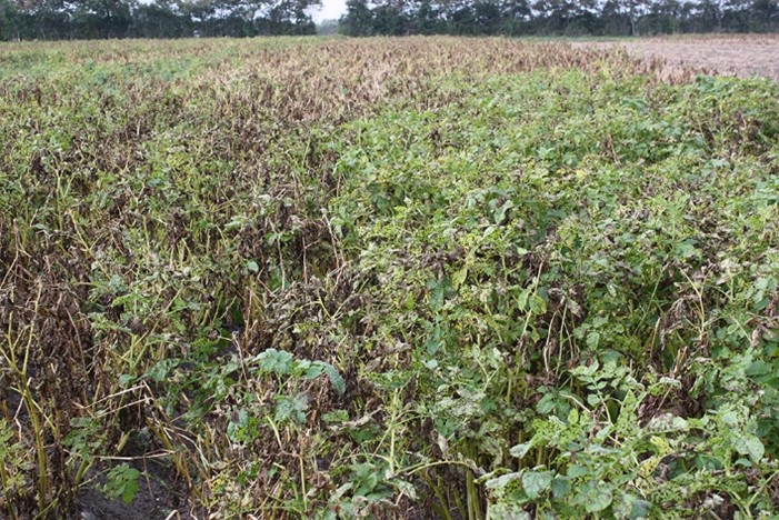 Figur 9. Mark i fuld vækst nedvisnet for tidligt i september som følge af kartoffelbladplet. De tilbageværende blade er fortsat grønne som følge af fortsat god næringsstofforsyning. De visne småblade udviser tydelige ringformede sorte nekroser, som afgrænses af ledningsstrengene.