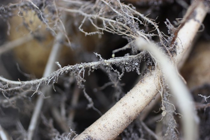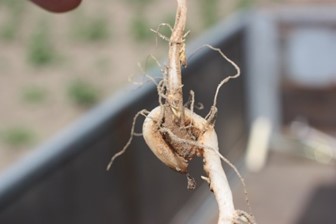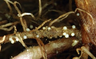 Fig. 6. Små hvide cyster på kartoffelrødder, som kan ses med det blotte øje. Brug gerne en lup.