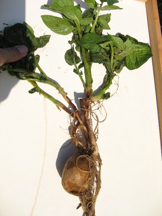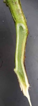 Figur 1. Symptomer på Kransskimmel i en dansk stivelsesmark, hvor småbladene på halvdelen af bladet visner, som følge af at kun enkelte ledningsstrenge blokeres (se brunfarvning i ledningsstrenge i højre side ved overskæring).
