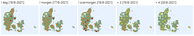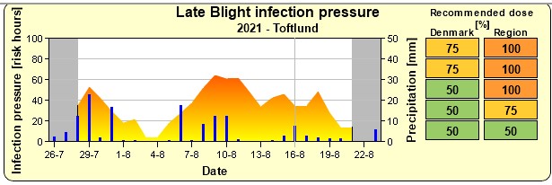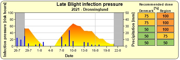 Der er nu spredt skimmel i mange marker, og vi fortsætter med at have skimmelfavorable forhold. Der bør behandles med fuld dosering Ranman Top/Revus. Hvor der er behandlet med 2,0 – 2,5 l/ha Proxanil, og der er styr på skimlen, anvendes kun forebyggende midler tilsat cymoxanil. I de marker hvor der er udbredt skimmel, og hvor der ikke er behandlet med Proxanil, bør der vælges en behandling med 2,0 l/ha Proxanil + 0,5 l/ha Ranman Top, hvor Proxanil blandes med Ranman Top på grund af Ranman Top’s sporedræbende effekt. I marker uden skimmel kan man nu overveje at anvende en forebyggende behandling med 2,0 l/ha Proxanil + 0,25 l/ha Ranman Top eller 2,0 l/ha Proxanil + 0,3 l/ha Revus. Bemærk, at der er forskellige intervaller for 0,25 kg/ha Cymbal 45 (minimum 7 dage) og 0,2 kg/ha Option (minimum 5 dage). I sorter med fortsat nytilvækst af blade (f.eks. Kuras) bør man være særligt påpasselig med at fastholde et ugentligt behandlingsinterval.