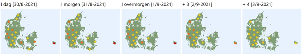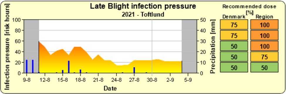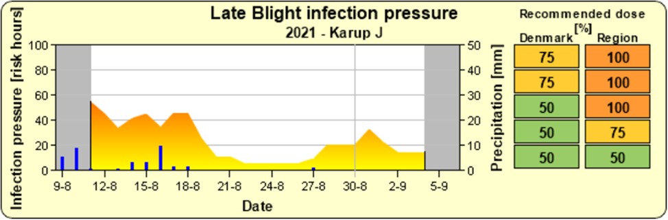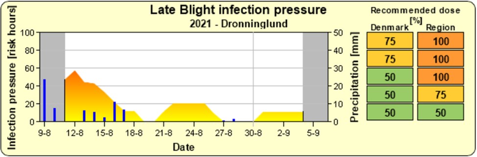 I den forgangne uge har det i den sydlige den af Jylland været skimmelvejr, mens det i Midt- og Nordjylland har været lavt smittetryk. Vejrudsigten lover tørvejr den kommende uge og nattemperatur, som svinger tæt på 10 °C, hvilket vil lægge en dæmper på skimmeludviklingen. Kun dugvåde marker til langt op ad formiddagen og aftagende vind holder liv i smitten.