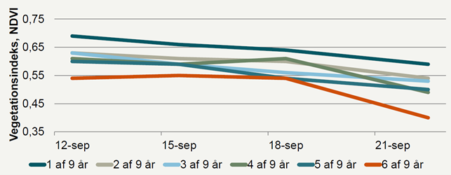 Det er tydeligt, at jo oftere der er kartofler i den pågældende mark, jo tidligere falder vegetationsindekset = jo tidligere afgror marken.