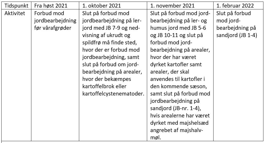 Der er en række ret komplicerede regler vedrørende jordbearbejdning her i efteråret før vårsåede afgrøder. Nedenfor er vist en tidslinie for de gældende regler i 2021:
