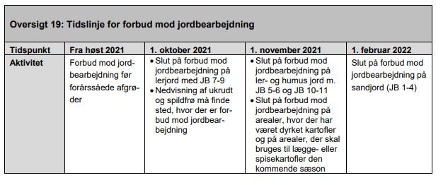I KartoffelNyt nr. 34 var den forkerte tabel fra Landbrugsstyrelsen indsat. I stedet er det nedenstående, der er gældende, hvor det er præciseret, at det kun er arealer forud for lægge- og spisekartofler der må jordbearbejdes efter d. 1. november.