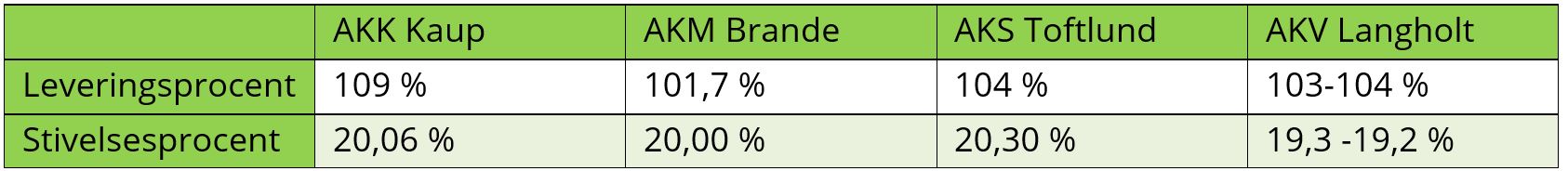 I skrivende stund er kampagnen for kartoffelmelsfabrikkerne i Karup, Brande og Toftlund afsluttet, mens kampagnen hos AKV Langholt forventes at slutte i begyndelsen af uge 3. Trods den udfordrende dyrkningssæson med regionale forskelle har fabrikkerne fået indvejet flere tønder end indkaldt. Stivelsesprocenterne i det syd og midtjyske har været rekordhøje, bla. har AKK Karup den højeste stivelsesprocent siden opstarten af fabrikken i 1933, alt imens nordjyderne har kæmpet med efterårstørken og få vandingsanlæg, som betyder at stivelsesprocenten næsten er 1 procentenhed lavere end de øvrige fabrikker.