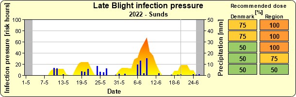 Der var mange steder i landet et højt infektionstryk omkring den første weekend i juni, og det er smitte derfra vi ser skimmelfundene nu. Se figur1, hvor der ses infektionstrykket for Sunds, der viser et infektionstryk på over 60. Vi er nu i en periode med meget lavt infektionstryk, dette kan dog hurtigt ændre sig, sammen med vejrudsigten ændre sig.