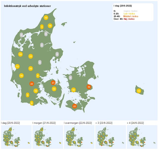 Figur 2 viser infektionstrykket nu og de næste dage, hvor det meste af landet har lav risiko. Kun et bælte fra Syd-/Midtjylland ind over Fyn, sydlige Sjælland, Lolland og Falster har et middel infektionstryk.