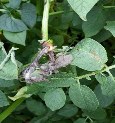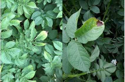 Der findes dog også fortsat aktivt skimmel, begunstiget af den fugt der er tilstede i de kraftige afgrøder. Det er ikke kun skimmelen, der har haft det tørt; kartoflerne har også haft det hårdt i varmen. Der skal være fuld gang i vandingsmaskinerne på nuværende tidspunkt, da kartoflerne fordamper 5 -6 mm vand om dagen på sådanne varme dage. Vi ser nu ind i en lidt køligere og mere ustadig vejrtype med varierende mængder af nedbør mange steder. Især i Midt, Nord og Vestjylland er der faldet nedbør hen over weekenden og mandag. Det betyder, at vi igen skal være på vagt mht. skimmelbekæmpelsen. Bladplet begynder også at vise sig, især på arealer med anstrengte sædskifter og sygdommen trives godt i det varme vejr vi har haft. Er det jomfruelige jorde, er der endnu ikke bladplet. Vi finder også cikadenymfer på de nederste blade i varierende mængder, og bekæmpelse vil nu være aktuel langt de fleste steder.
