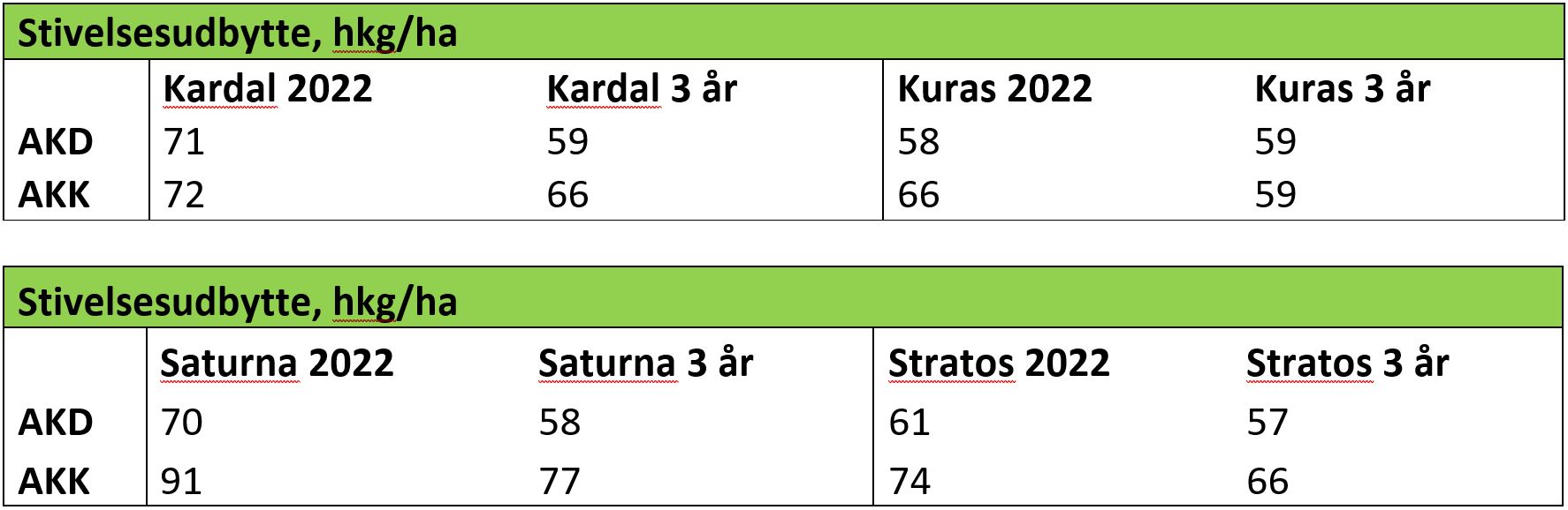 Den første prøveopgravning fra henholdsvis AKD og AKK kom frem i sidste uge. Saturna ligger gennemsnitlig i stivelsesprocent, men har derimod høj hkg. Stivelse og ligger her pænt over gennemsnit for de sidste tre år. Generelt ligger stivelsesudbytterne pænt på mange sorter fra både AKD og AKK. Det har også været forventningen, da vi generelt har haft, et indtil videre, godt kartoffelår, hvor de er blevet lagt til tiden, det har været køligt og regnet nogenlunde rettidigt de fleste steder.